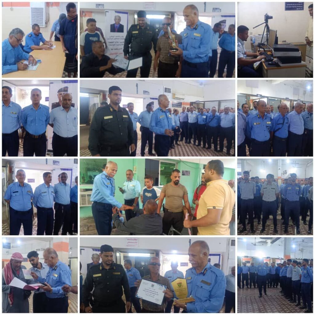 كرم الاتحاد الوطني لجمعيات المعاقين اليمنين صباح اليوم مدير عام فرع مصلحة الهجرة والجوازات بالعاصمة عدن العميد / نصر فضل الشاووش العقربي ومدير عام فرع مصلحة الاحوال المدنية العقيد / مصطفى محمد النخعي وموظفي مصلحة الهجرة والجوازات بدروع الاتحاد التي قام بتسليمها للمحتفى بتكريمهم الاستاذ / صالح النادري رئيس الاتحاد الوطني لجمعيات المعاقين اليمنين خلال الطابور الصباحي ، لمنتسبي فرع الإدارة العامة لمصلحة الهجرة والجوازات بالعاصمة عدن .