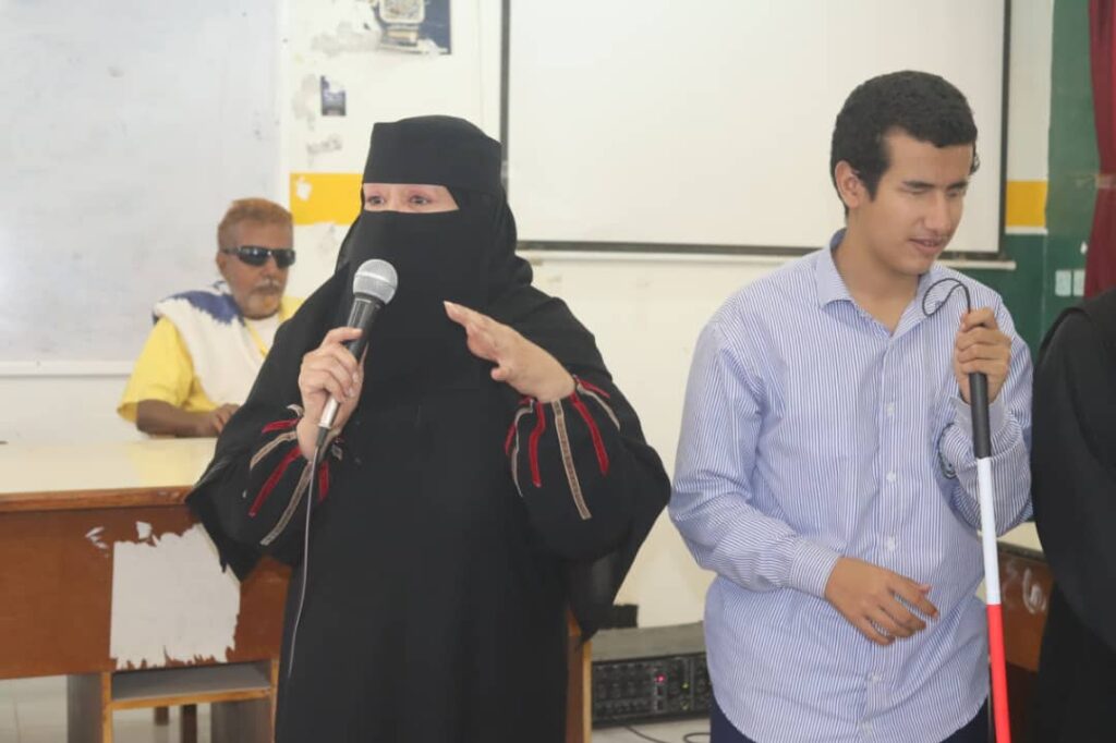وخلال الندوة التي حضرها طلاب وطالبات كلية التربية صبر قدم أعضاء جمعية المكفوفين شرحا توضيحيا حول العصا البيضاء التي يستخدمها الكفيف كنوع من المساعدة في المشي بالطرقات وأهميتها ، كما تم إعطاء نبده عن عمل وخدمات الجمعية التي تقدمها لفئة المكفوفين ومنها الخدمة التعليمية ، إلى جانب ذلك شهدت الندوة قدمت أحد كفيفات الجمعية ” سناء دهمس ” تجربتها في خوضها التعليم الجامعي وتخرجها من كلية المجتمع بعدن وأخذها دورات لغة وحاليا في إطار أن تناقش رسالتها بالماجستير في شهر ديسمبر القادم 2025 .