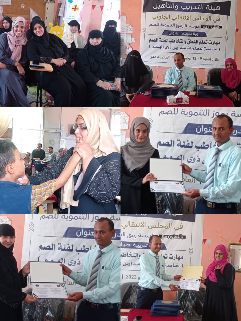 اختتمت اليوم في مقر مؤسسة رموز الدورة التدريبية التي اقامتها هيئة التدريب والتاهيل في المجلس الانتقالي الجنوبي وبالتعاون مع مؤسسه رموز للصم، والتي تم فيها تعلم مهارة النطق والتخاطب لفئة الصم.