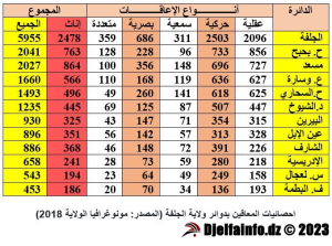 وبملاحظة تعداد المعاقين في الدوائر نجد أنها جميعا تتوفر على معيار الكثافة المدرسية إذ أن دائرة فيض البطمة لوحدها يوجد بها 453 معاقا وهي تقبع في ذيل الترتيب. وبلغة الأرقام للمعاقين حركيا وعقليا فالولاية ككل لا يوجد بها سوى 03 مراكز طبية بيداغوجية بعاصمة الولاية وعين وسارة وملحقتان فقط بمسعد وحاسي بحبح مقابل 7416 معاقا حركيا و6616 معاقا عقليا.