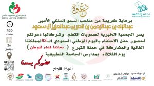 اعلنت الجمعية الخيرية لصعوبات التعلم وشركائها عن دعوة عامة لحضور حفل الاحتفاء باليوم الوطني السعودي الـ(93) لمملكتنا الغالية والمشاركة في حملة التبرع ( دمائنا فداء للوطن ) .