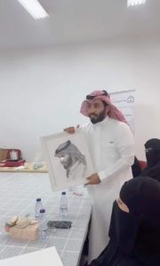 ظهر المطيري وهو يتحدث مع الفتاة التي رسمت لوحة تحمل ملامحه بصورة شبه متطابقة باللون الأبيض والأسود حيث أنها تعاني من عمى بالألوان ولا ترى سوى اللون الأسود