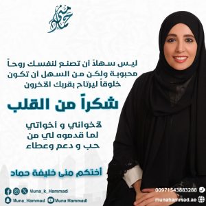 هذا واطلقت المرشحة ” منى خليفة ” برنامجها الانتخابي تحت شعار ” معا .. نصنع بصمة وطن حيث يتمحور برنامجها بقضايا تتعلق بذوي الهمم منها .. ما يتعلق في الادماج الشامل للأشخاص ذوي الإعاقة ، بالإضافة إلى قضايا.. المسؤولية المجتمعية والمواطنة الصالحة والهوية الوطنية الإماراتية ودعم وتمكين المرأة الإماراتية .