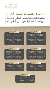 اصدر رئيس دولة الإمارات محمد بن زايد مرسوما اتحاديا بتشكيل أعضاء المجلس الوطني الاتحادي لدور انعقاد الفصل التشريعي الثامن عشر .
