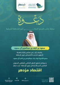 برعاية صاحب السمو الملكي الأمير سعود بن نايف بن عبدالعزيز آل سعود ندعوكم لحضور الحفل الختامي للملتقى السنوي الخامس لأسر الأشخاص ذوي الإعاقة تحت شعار اقتصاد مزدهر والذي يقام يوم الاثنين 4 ديسمبر ٢٠٢٣وذلك في تمام الساعة 7:00م في مقر أمانة المنطقة الشرقية .