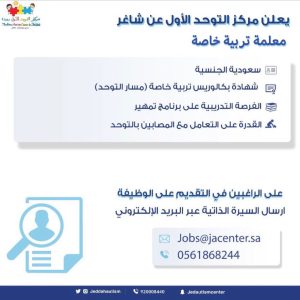 أعلن مركز التوحد الأول عن شاغر وظيفي بمسمى معلمة تربية خاصة