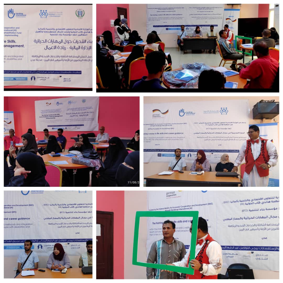 بدأت اليوم بعدن أعمال البرنامج التدريبي الخاصة في بناء القدرات بمجال المهارات الحياتية، والإدارة المالية وريادة الاعمال للأشخاص ذوي الاعاقة الذي تنفذه مؤسسة بناء للتنمية ضمن مشروع سبل العيش المستدامة للأشخاص ذوي الإعاقة واسرهم المتضررين من الأزمة وأسرهم في بلادنا .