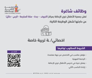 اعلنت جمعية الأطفال ذوي الإعاقة عن توافر وظيفة شاغرة بمسمى (أخصائي/ أخصائية) تربية خاصة في كل من المدن التالية :-