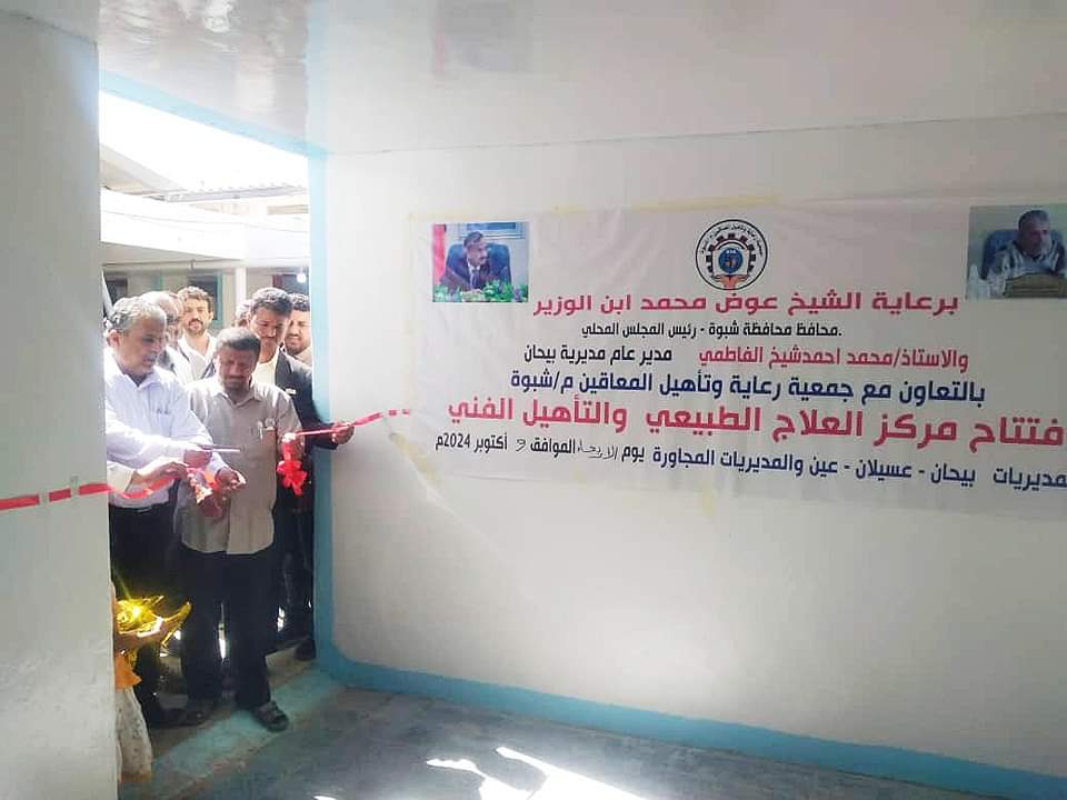 برعاية محافظ محافظة شبوة، عوض محمد بن الوزير، إفتتح مدير عام مديرية بيحان، محمد احمد شيخ، مركز العلاج الطبيعي، بالتعاون مع جمعية رعاية وتأهيل المعاقين.