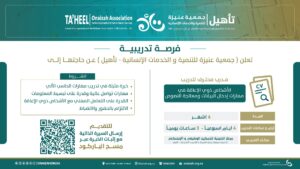 تعلن جمعية عنيزة للتنمية والخدمات الإنسانية (تأهيل) عن توفر فرصة تدريبية لتوظيف:
