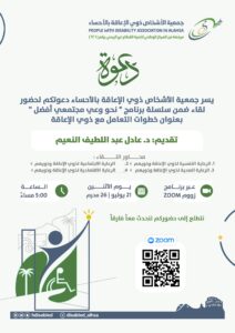 تعتزم جمعية الأشخاص ذوي الإعاقة”بمنطقة الأحساء تنظيم ورشة عمل بعنوان “الأهداف التنموية المستدامة وأهميتها للأشخاص ذوي الإعاقة” عبر منصة زووم.