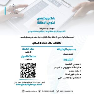 يسر منصة مدد، بالتعاون مع شركائها الداعمين لتوظيف ذوي الإعاقة، الإعلان عن توفر فرصة وظيفية بمدينة الرياض في مجال خدمة العملاء.