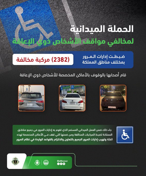 تمكن المرور السعودي من ضبط وتغريم 2382 مركبة مخالفة للوقوف في الأماكن المخصصة للأشخاص ذوي الإعاقة وفق بيان جاء على حسابه الرسمي في منصة إكس.