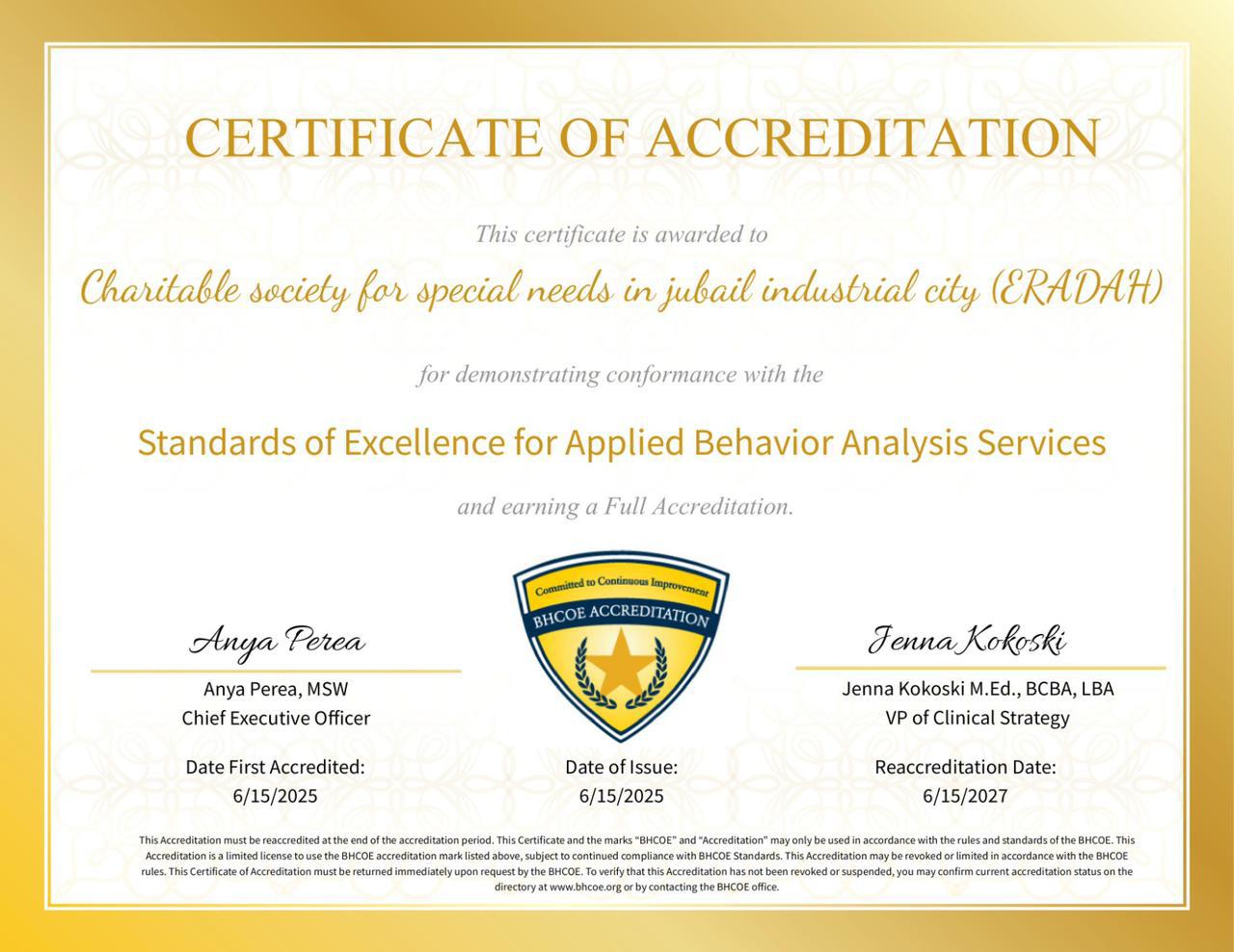 حصلت الجمعية الخيرية لذوي الاحتياجات الخاصة بالجبيل الصناعية “إرادة” على اعتماد هيئة BHCOE، وهي جهة دولية مرموقة متخصصة في تقييم أداء المؤسسات المقدمة للخدمات التأهيلية والعلاج السلوكي.
