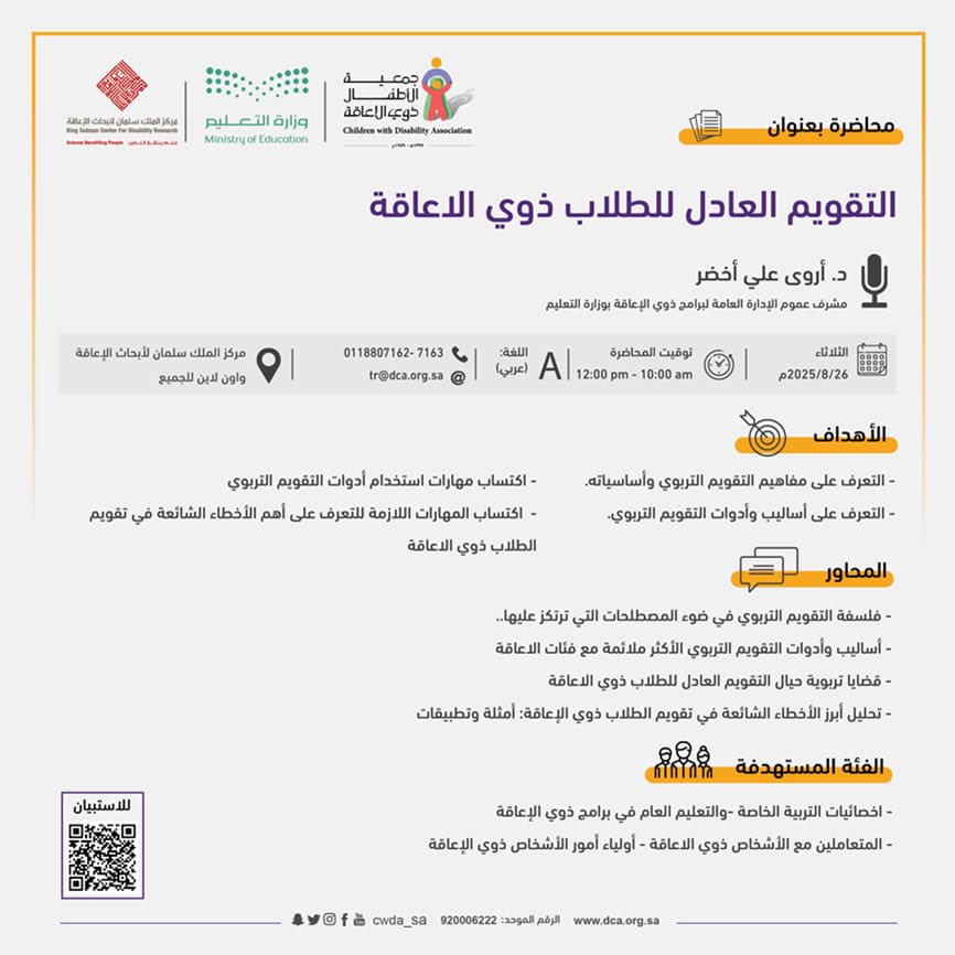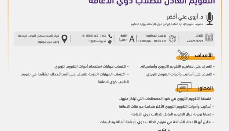 ينظم مركز الملك سلمان لأبحاث الإعاقة، بالتعاون مع جمعية الأطفال ذوي الإعاقة ووزارة التعليم، ندوة تثقيفية بعنوان “التقويم العادل للطلاب ذوي الإعاقة” ضمن برنامج تمكين التعليم للطلاب ذوي الإعاقة (عن بعد).