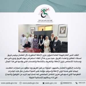 التقى المدير العام للهيئة العامة لشؤون ذوي الإعاقة، الدكتورة دلال العثمان، بفريق “أصدقاء المعاقين”. جرى خلال اللقاء استعراض مهام الفريق ودوره في دعم ومساندة الأشخاص ذوي الإعاقة، والتعريف بالأنشطة والخدمات التي تقدمها الهيئة في هذا المجال.