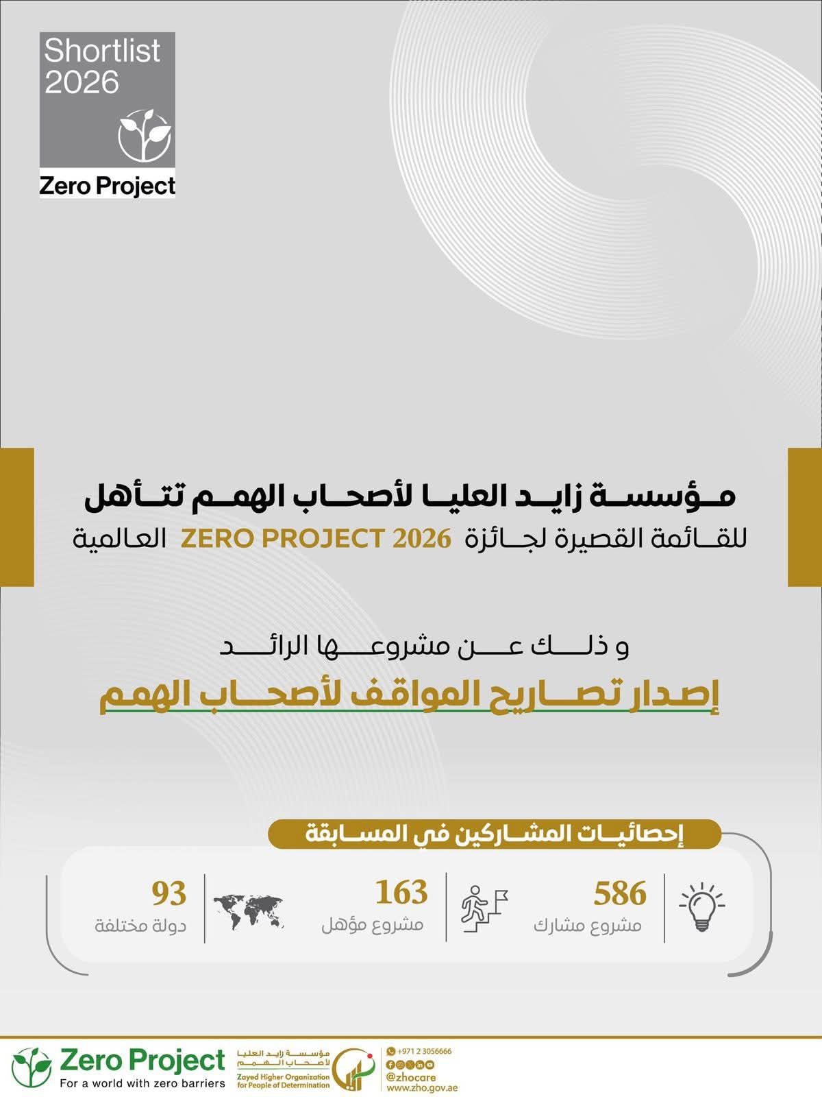 ضمن 586 مشروعًا مشاركًا من 93 دولة مختلفة، تأهلت مؤسسة زايد العليا لأصحاب الهمم للقائمة القصيرة لجائزة Zero Project 2026 العالمية.