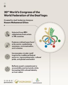 أبوظبي، الإمارات العربية المتحدة – كشف المؤتمر العالمي العشرين للاتحاد العالمي للصم، الذي تستضيفه أبوظبي في الفترة من 19 إلى 23 سبتمبر 2027، عن شعاره الرسمي الذي صممه الفنان الأردني الأصم حسام محمد الفرا. ويعكس الشعار التزام الحدث بالشمولية وسهولة الوصول، مع الاحتفاء بالهوية الثقافية لدولة الإمارات العربية المتحدة بصفتها الدولة المضيفة.
