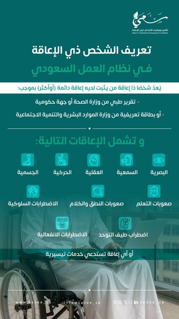 الرياض_ أوضح نظام العمل السعودي مفهوم “الشخص ذي الإعاقة”، حيث يُعتبر كل من يمتلك تقريرًا طبيًا أو بطاقة تعريفية صادرة عن الجهات الرسمية المختصة شخصًا ذا إعاقة.