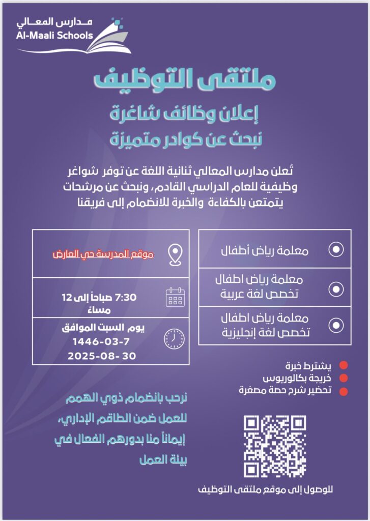 الرياض، المملكة العربية السعودية – أعلنت مدارس المعالي عن تنظيم ملتقى توظيف للعام الدراسي القادم، مؤكدة على حرصها لاستقطاب الكوادر المتميزة، ومرحبة بانضمام الأشخاص ذوي الهمم للعمل ضمن فريقها الإداري، وذلك إيماناً منهم بدورهم الفعال والمؤثر في بيئة العمل.