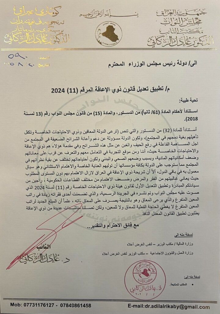 وثيقة: الركابي يطالب السوداني بتطبيق تعديل قانون حقوق ذوي الإعاقة وزيادة امتيازاتهم
