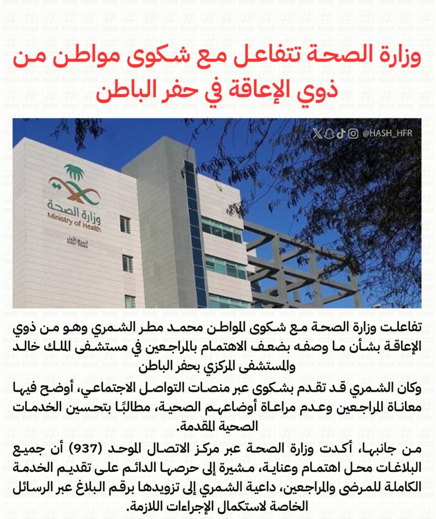 وزارة الصحة تستجيب لشكوى مواطن من ذوي الإعاقة حول الخدمات الصحية بحفر الباطن