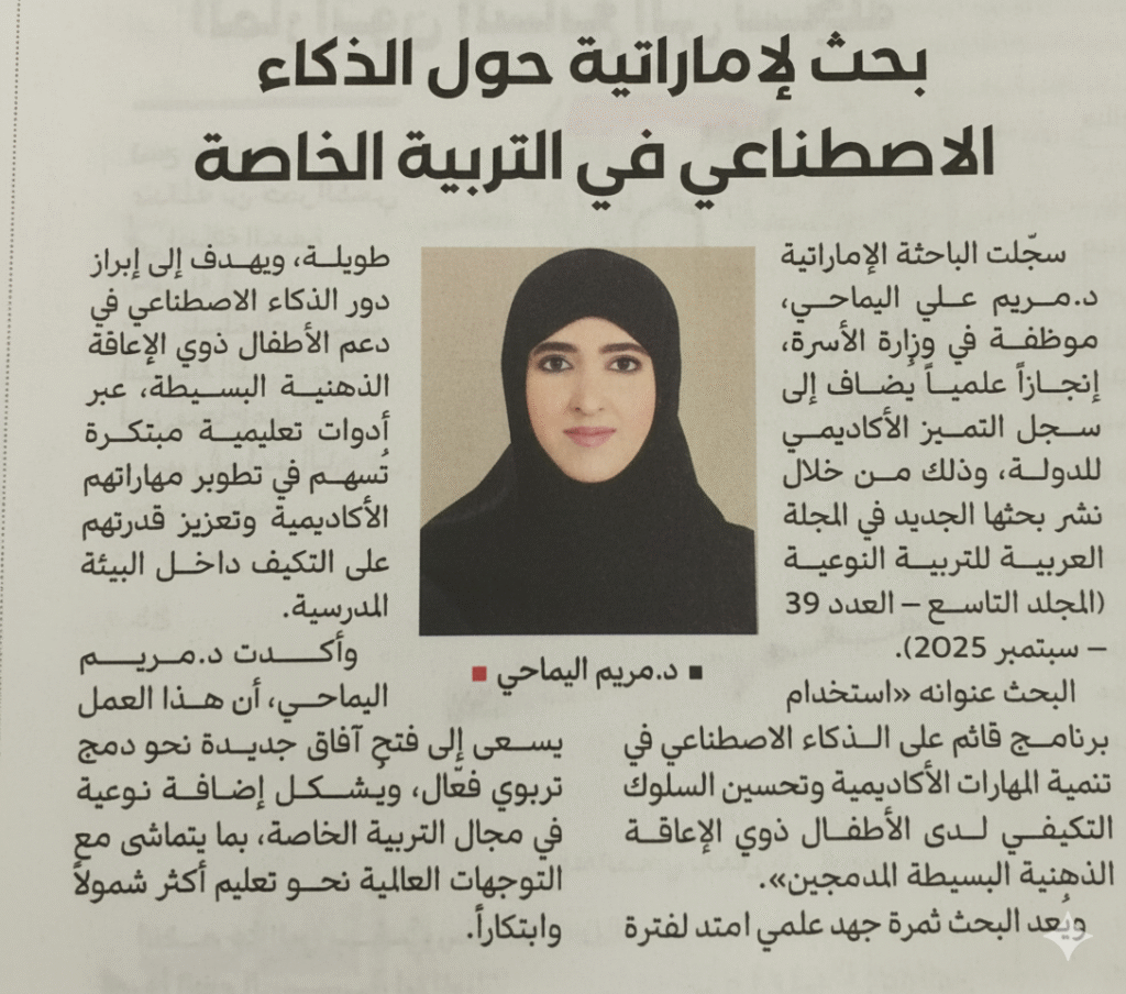 جاء هذا الإنجاز من خلال نشر بحثها بعنوان “استخدام برنامج قائم على الذكاء الاصطناعي في تنمية المهارات الأكاديمية وتحسين السلوك التكيفي لدى الأطفال ذوي الإعاقة الذهنية البسيطة المدمجين” في المجلة العربية للتربية النوعية (المجلد التاسع – العدد 39 – سبتمبر 2025).