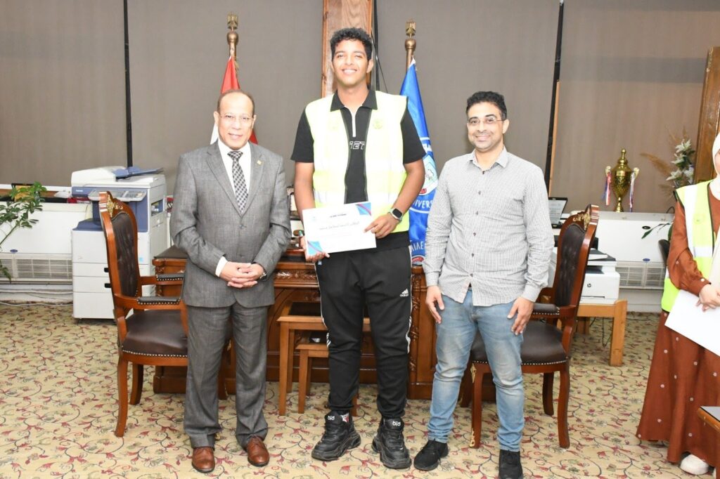 وخلال مراسم التكريم، تم الاحتفاء بفريق الطلاب المتطوعين بقيادة الطالب محمد محمود رئيس الاتحاد، والطالب عبد الله حمدي نائب رئيس الاتحاد، والطالب عبد الله عطا ممثل الطلاب ذوي الهمم بالاتحاد، تقديرًا لمشاركتهم الفاعلة في تنظيم الزيارة التثقيفية للمتحف القومي للحضارة المصرية بالقاهرة لطلاب ذوي الهمم، إلى جانب دورهم في تنظيم أعمال اللجنة الطبية لقبول الطلاب الجدد من ذوي الهمم.