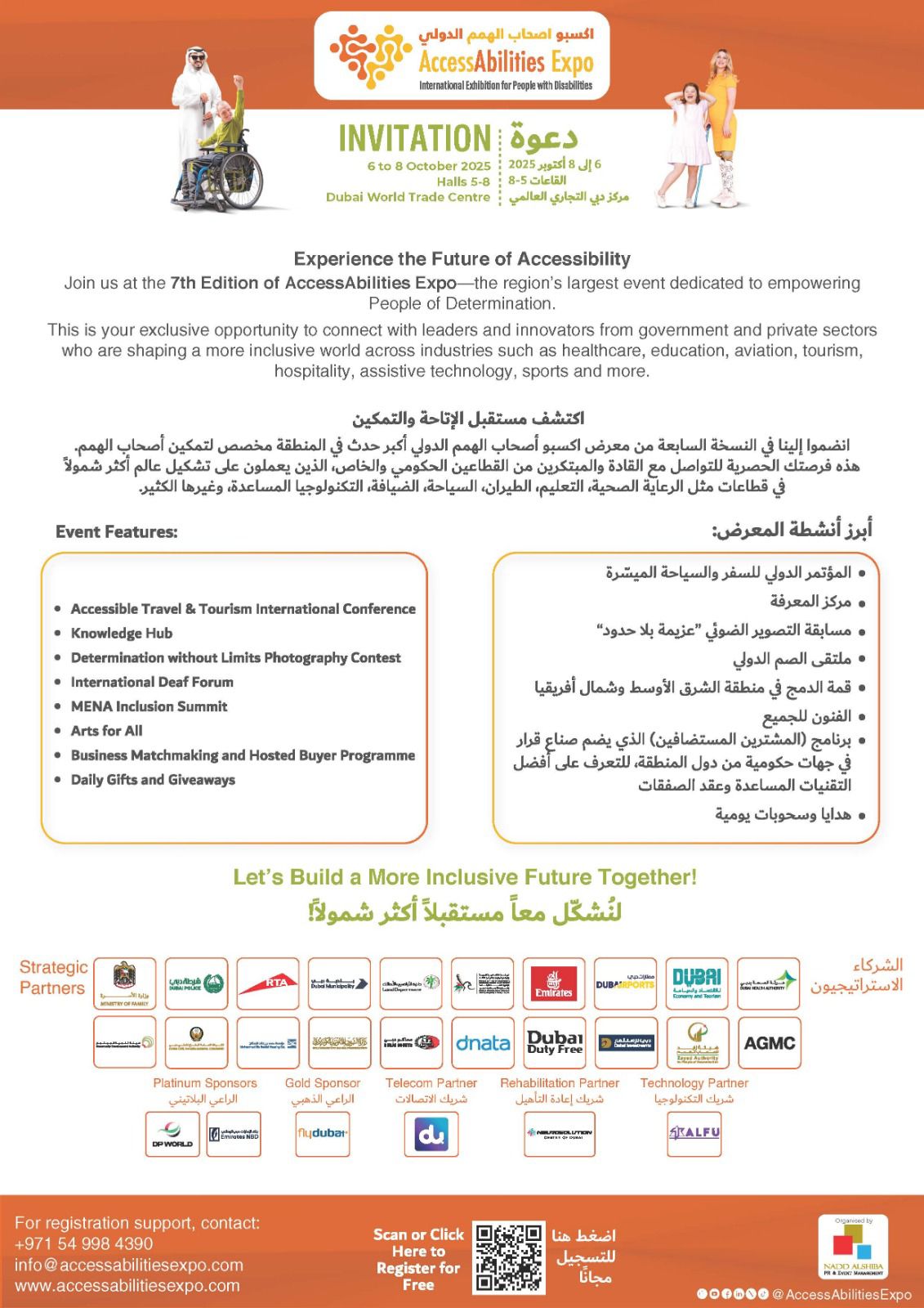 تستضيف دبي الحدث الأكبر من نوعه في المنطقة، وهو الدورة السابعة من “إكسبو أصحاب الهمم الدولي” (AccessibleEmotions Expo)، والذي يُعقد في الفترة من 6 إلى 8 أكتوبر 2025 في مركز دبي التجاري العالمي.