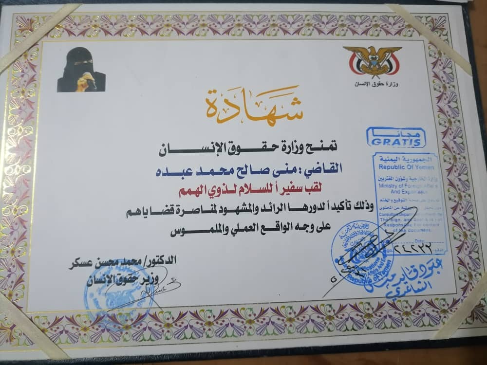 ويُعد هذا التكريم تتويجًا لمسيرة حافلة بالعطاء، حيث عُرفت القاضي منى صالح بجهودها الإنسانية والحقوقية الواسعة، وبصمتها البارزة في نشر ثقافة السلام والتسامح، ومساندة الفئات الأكثر احتياجًا في المجتمع، مما جعلها تحظى بتقدير واسع داخل اليمن وخارجه.