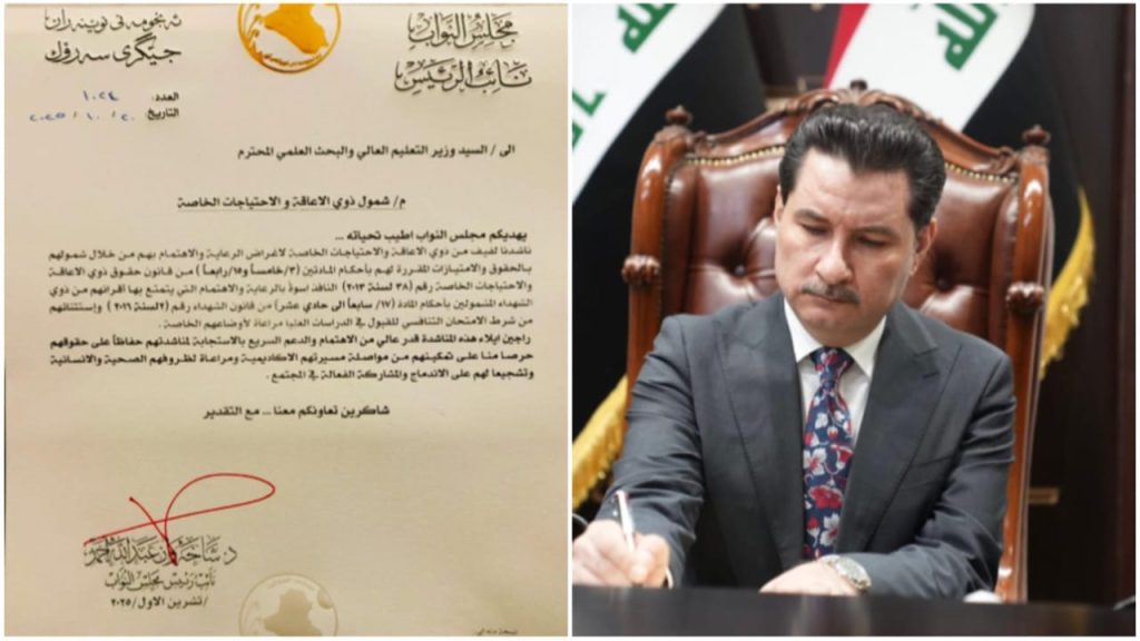 استجابةً لمناشدة لفيفٍ من ذوي الإعاقة والاحتياجات الخاصة، وجّه سيادة نائب رئيس مجلس النواب، الدكتور شاخوان عبدالله، خطابًا رسميًا إلى معالي وزير التعليم العالي والبحث العلمي في الحكومة الاتحادية، دعا فيه إلى ضرورة الاهتمام بهذه الشريحة المهمة من المجتمع، وشمولهم بالحقوق والامتيازات التي كفلها لهم قانون ذوي الإعاقة والاحتياجات الخاصة رقم (38) لسنة 2013.
