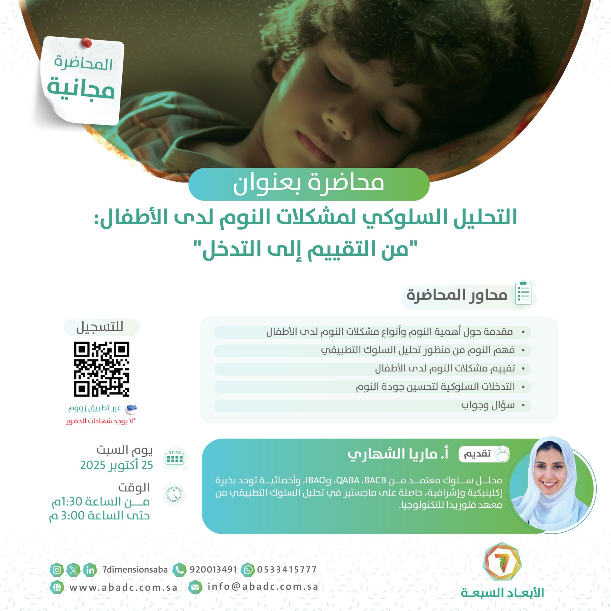 تنظم محاضرة مجانية عبر الإنترنت بعنوان: “التحليل السلوكي لمشكلات النوم لدى الأطفال: من التقييم إلى التدخل”، والتي تقدمها الأستاذة ماريا الشهاري.