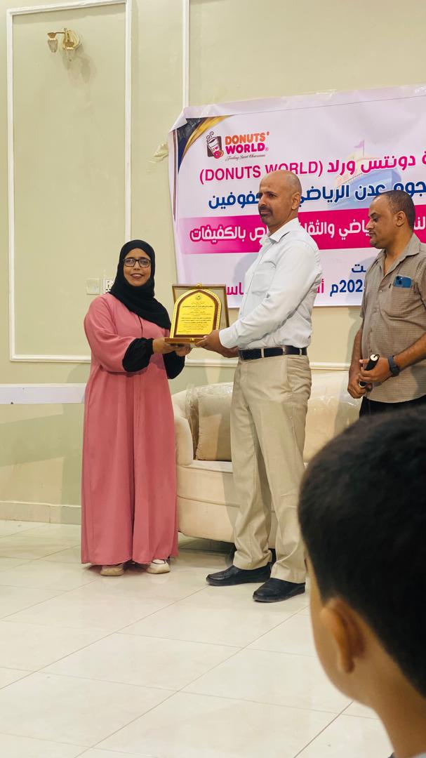 من جانبها، قالت *الأستاذة أروى العمري*، رئيسة نادي نجوم عدن الرياضي، إن هذه الفعالية تأتي ضمن سلسلة الأنشطة الدورية التي ينظمها النادي، وهي مخصصة للكفيفات من أعضاء النادي، موضحة أن النادي يحرص على تقديم فعاليات رياضية خاصة بالمكفوفين والكفيفات، وأنه من المخطط أن تكون هذه الفعاليات شبه مستمرة في العام القادم. كما وجهت شكرها لشركة *Donuts’ World* على رعايتها ودعمها لهذه الفعالية.