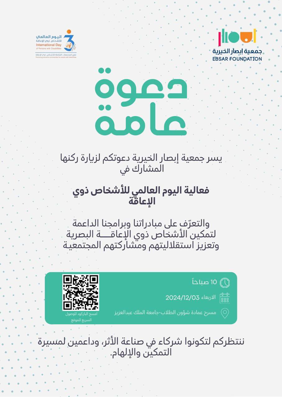 يسر جمعية #إبصار الخيرية دعوتكم لزيارة ركنها المشارك في فعاليات #اليوم_العالمي_للأشخاص_ذوي_الإعاقة والتعرّف على مبادراتها وبرامجها الداعمة لتمكين الأشخاص ذوي الإعاقة البصرية وتعزيز استقلاليتهم ومشاركتهم المجتمعية.