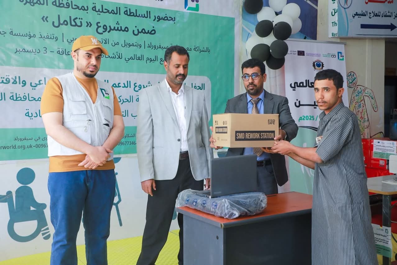 اختتمت مدينة الغيضة بمحافظة المهرة، اليوم، فعاليات مشروع الدعم النفسي والاجتماعي والاقتصادي للأشخاص ذوي الإعاقة الحركية المتأثرين بالنزاع – المهرة، الذي يأتي ضمن مشروع «تكامل» بالشراكة مع منظمة سيفرورلد، وبتمويل من الاتحاد الأوروبي، وتنفيذ مؤسسة جسر للتنمية.