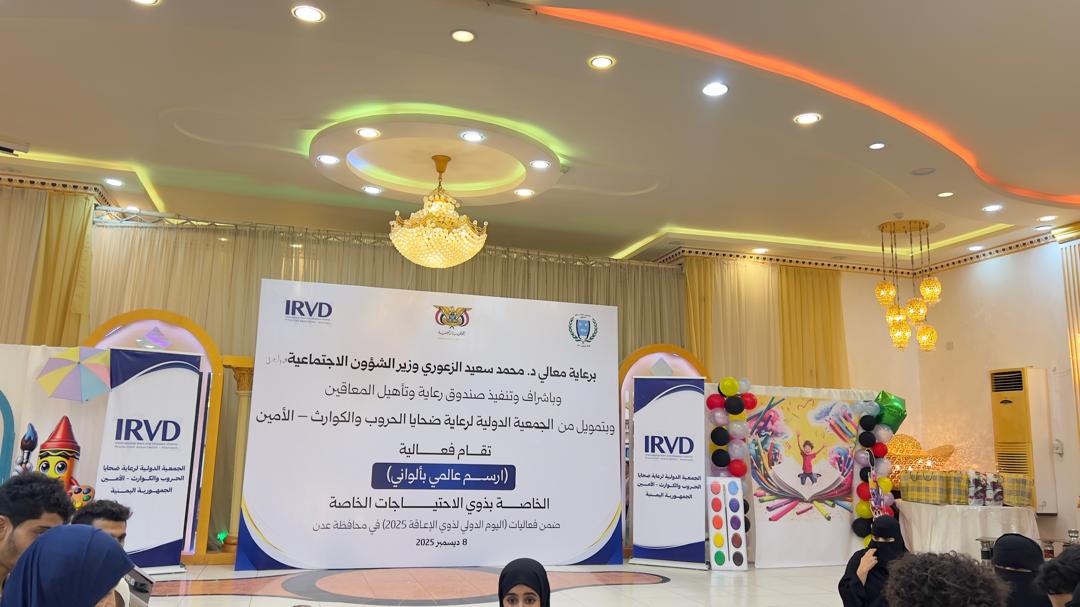 برعاية معالي الدكتور سعيد الزعوري وزير الشؤون الاجتماعية والعمل، وبإشراف وتنفيذ صندوق رعاية وتأهيل المعاقين وتمويل من الجمعية الدولية لرعاية ضحايا الحروب والكوارث، احتضنت محافظة عدن فعالية فنية وإنسانية بعنوان “ارسم عالمي بألواني”، المخصصة للأطفال من ذوي الاحتياجات الخاصة، وذلك ضمن فعاليات اليوم الدولي لذوي الإعاقة 2025.
