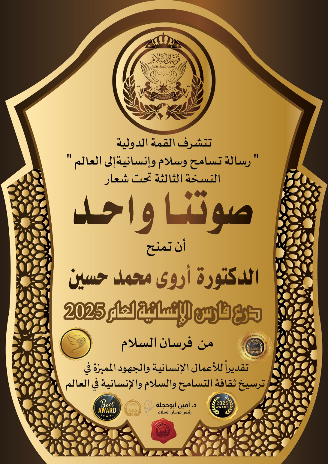 ويُعد هذا التتويج تتويجًا مستحقًا لمسيرة حافلة بالإنجازات، ودافعًا لمواصلة العمل الإنساني، وترسيخ قيم السلام والتسامح، في عالم أحوج ما يكون إلى مثل هذه النماذج المشرقة.