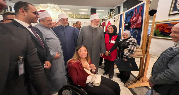 افتتح الدكتور نظير عياد مفتى الجمهورية، يرافقه الدكتور محمد الضوينى وكيل الأزهر الشريف، والدكتورة إيمان كريم، المشرف العام على المجلس القومى للإعاقة، على هامش احتفالية الأزهر الشريف بذوى الهمم، معرِض الأعمال الفنية للعلمين، والطلاب الأزهريين من ذوى الهمم، بقطاع المعاهد الأزهرية. وتضمن المعرض عددًا من منتجات مبادرة «حرفتنا من تراثنا»، إلى جانب إسهامات عدد من ذوى الهمم، وجمعيات المجتمع المدني. وعقب الافتتاح، أكد مفتى الجمهورية، أن الشريعة الإسلامية كرمت الإنسان، ورفعت من شأنه، وجعلت معيار التفاضل قائمًا على التقوي، والعمل الصالح، واصفًا النماذج الملهمة بأنها رسالة أمل.