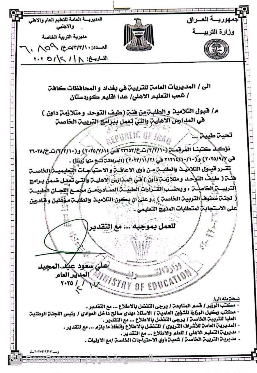 وقالت الوزارة بحسب وثيقة تلقتها “وكالة فيديو الإخبارية”، إن وزارة التربية/المديرية العامة للتعليم العام والاهلي والاجنبي تقرر قبول التلاميذ والطلبة من فئة (طيف التوحد ومتلازمة داون) في المدارس الأهلية التي تعمل ضمن برامج التربية الخاصة، على ان يكونوا مؤهلين وقادرين على الاستجابة لمتطلبات المنهج التعليمي، وكما موضح في الأدنى: –