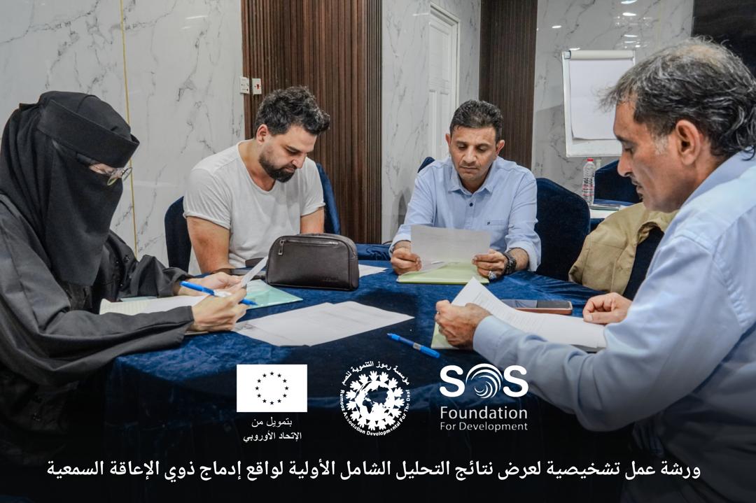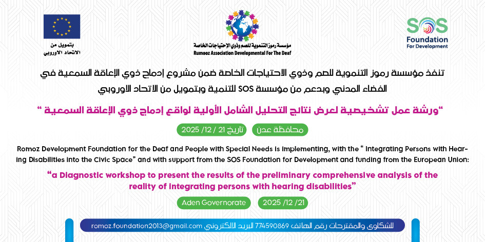 دشنت مؤسسة رموز التنموية للصم وذوي الاحتياجات الخاصة، اليوم الأحد ۲۱ ديسمبر ۲۰۲۵، ورشة عمل تشخيصية نوعية لعرض نتائج التحليل الشامل الأولية لواقع إدماج الأشخاص ذوي الإعاقة السمعية في محافظة عدن، ويأتي هذا النشاط كخطوة محورية ضمن مشروع “إدماج ذوي الإعاقة السمعية في الفضاء المدني”، بدعم من مؤسسة sos التنموية وتمويل الاتحاد الأوروبي.