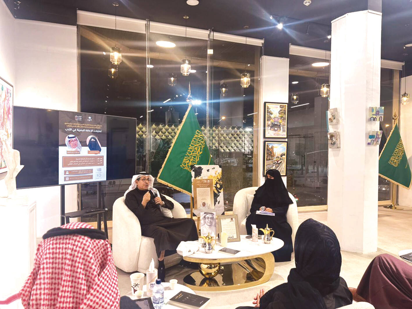 واستضاف اللقاء الأديب والناقد الأستاذ الدكتور معجب العدواني، وقدّمته الأستاذة الدكتورة أمل التميمي، حيث ناقش الحوار محاور متعددة، من بينها البلاغة وتشكل الإعاقة البصرية، وتمثيلاتها في السرد والشعر والفن، والانتقال من خطاب النقص إلى خطاب التمكين. وأشار العدواني إلى أن ما يقدّمه المبدع يندرج ضمن “الهالة” التي يخلقها النص، حيث لا تُقاس التجربة الإبداعية بحدود الإعاقة، بل بقدرتها على إنتاج الدهشة وتكثيف المعنى.