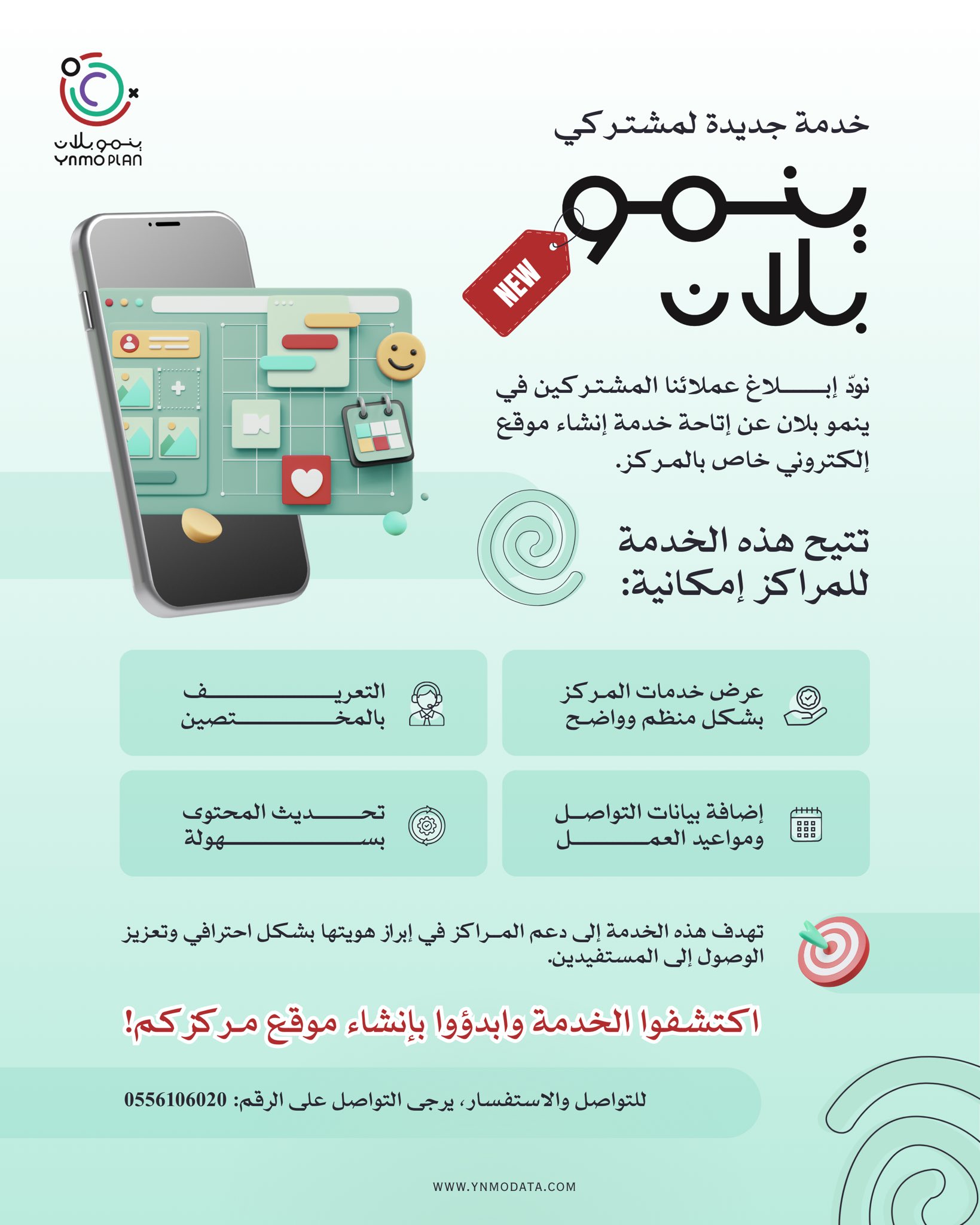 ​ودعت المنصة جميع المراكز الراغبة في تطوير حضورها الرقمي إلى استكشاف الخدمة والبدء في إنشاء مواقعها الخاصة عبر زيارة موقعها الإلكتروني www.ynmodata.com أو التواصل المباشر عبر الرقم (0556106020)
