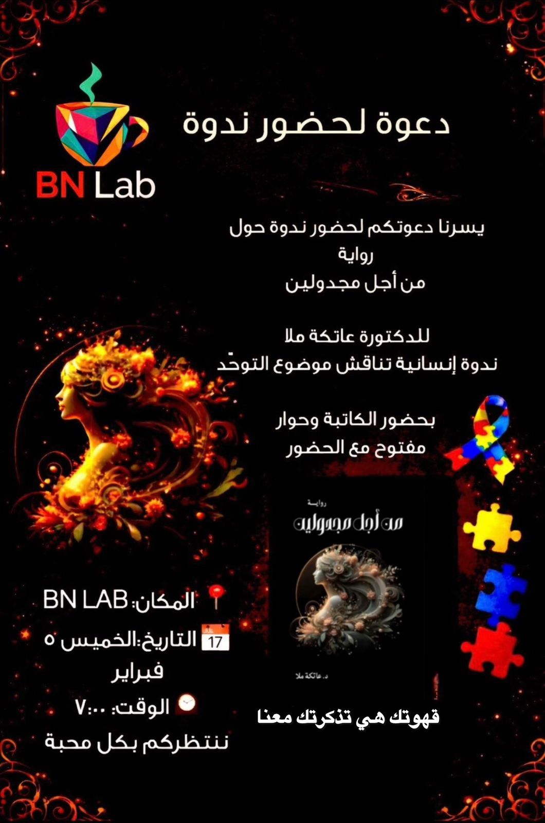 يستضيف مركز “BN Lab” الثقافي بفرع “بريستيج مول” على طريق الملك، ندوة ثقافية وإنسانية استثنائية لمناقشة رواية “من أجل مجدولين”، من تأليف الدكتورة عاتكة ملا.