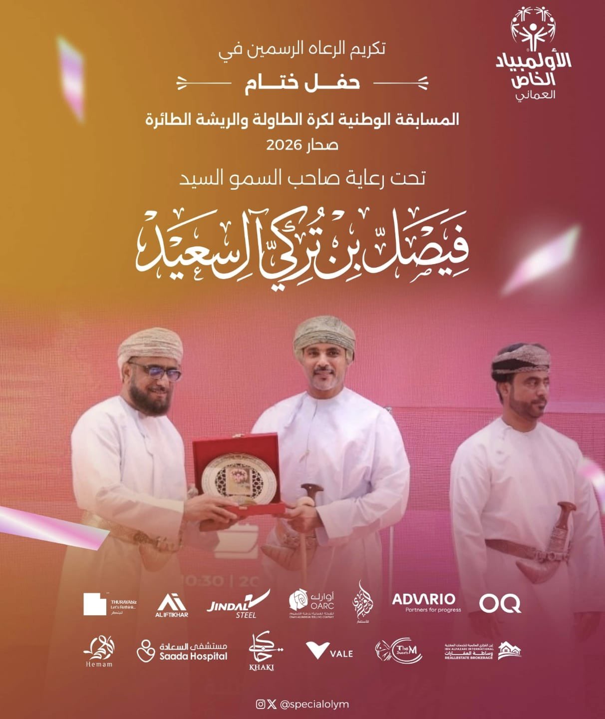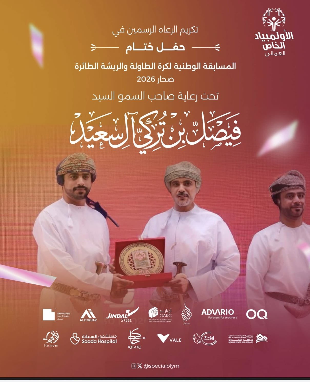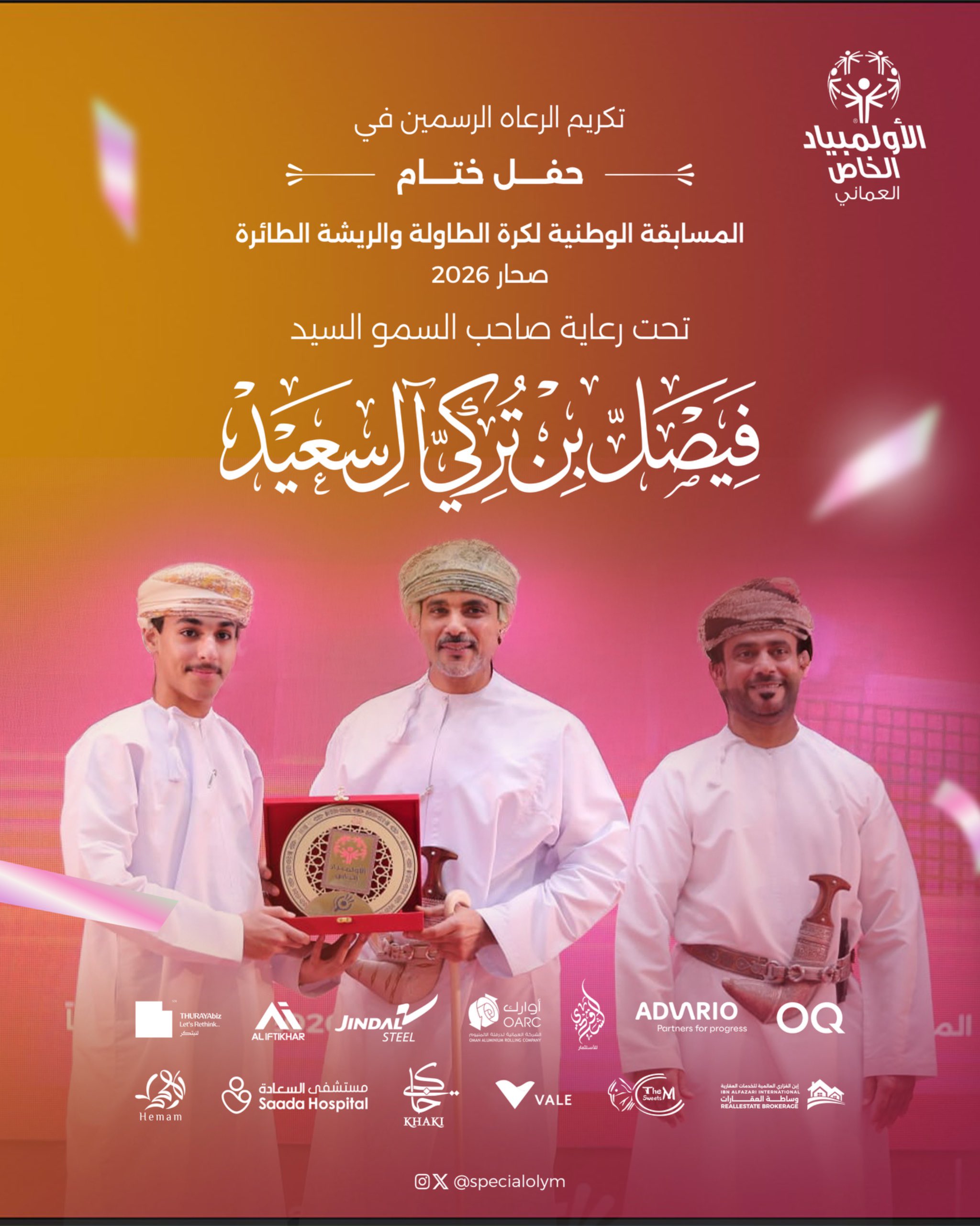 أعربت اللجنة المنظمة للمسابقة الوطنية لكرة الطاولة والريشة الطائرة للأشخاص ذوي الإعاقة الفكرية عن بالغ شكرها وتقديرها لكافة الشركاء والجهات الداعمة، وذلك بعد النجاح الباهر الذي حققته البطولة التي نظمها الأولمبياد الخاص العماني بالمجمع الرياضي بصحار.