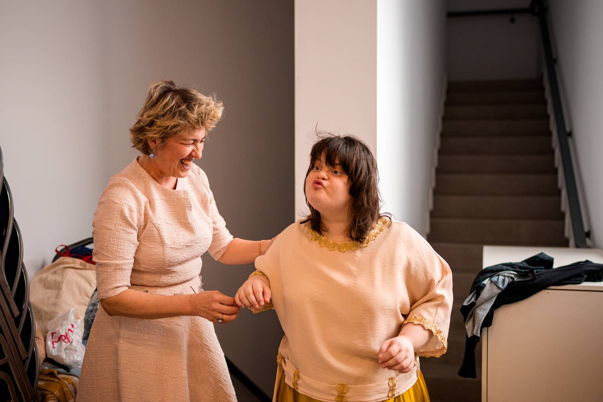 Carmen Neagu, right, tries on her outfit before the SEEN Anonymous Seamstresses Gala, an event organised by the Down Plus Bucharest, an NGO supporting youngsters with Down Syndrome and other intellectual disabilities, in Bucharest, Romania, Wednesday, March 18, 2026, ahead of the World Down Syndrome Day, on March 21. (AP Photo/Andreea Alexandru)