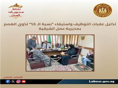 وأكد وكيل الوزارة على استمرار المتابعة اليومية لحصر واستيفاء نسبة الـ 5% بكافة المنشآت لضمان حياة كريمة وحقهم في العمل بمحافظة الشرقية.