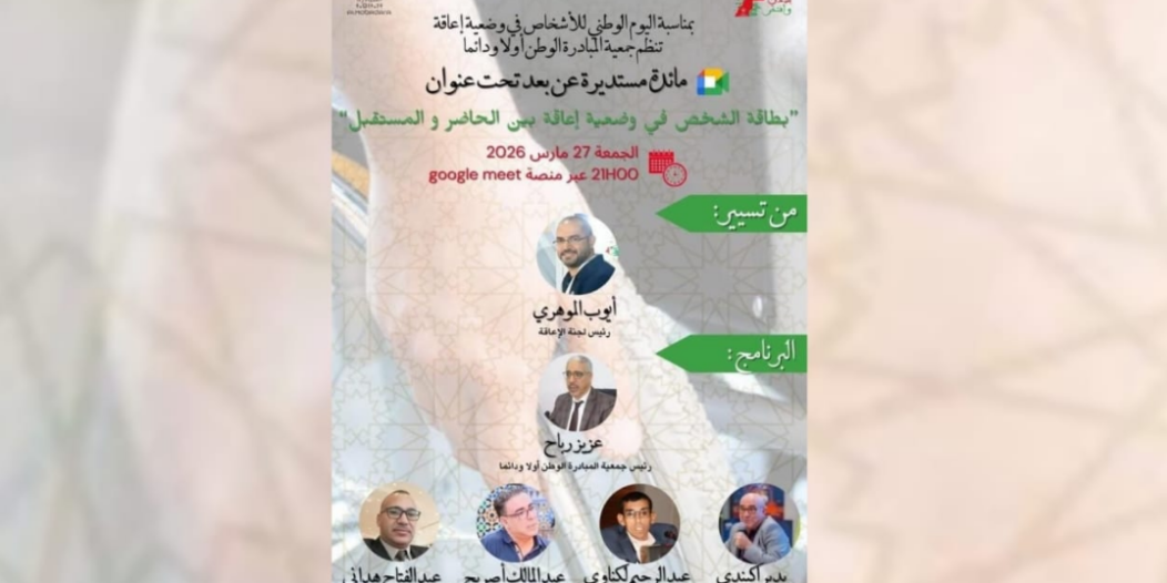تخليداً لليوم الوطني للأشخاص في وضعية إعاقة، أعلنت جمعية المبادرة “الوطن أولا ودائما” عن تنظيم مائدة مستديرة رقمية تسلط الضوء على موضوع بالغ الأهمية تحت عنوان: “بطاقة الشخص في وضعية إعاقة بين الحاضر والمستقبل”.