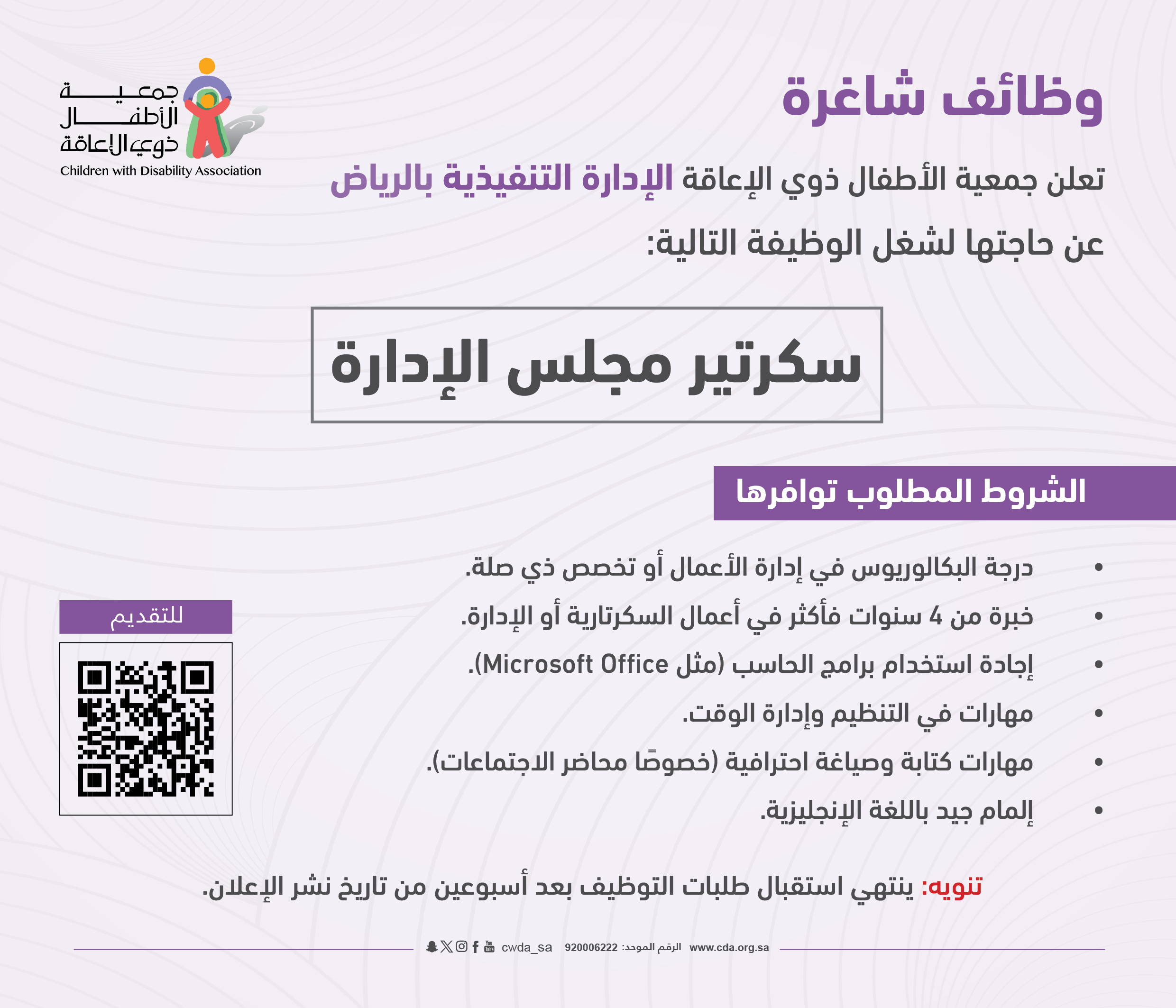 جمعية الأطفال ذوي الإعاقة بالرياض تعلن عن فتح باب التوظيف لوظيفة “سكرتير مجلس الإدارة”