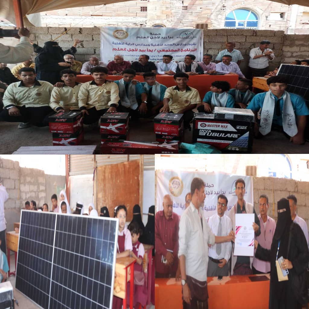 ضمن حملة ” يد بيد لأجل العلم ” سلمت مدارس المجد الأهلية ومدارس الراية الأهلية صباح اليوم الخميس منظومة طاقة شمسية متكاملة لإدارة جمعية رعاية وتأهيل الصم والبكم بمحافظة لحج ، وسط حضور عدد من الشخصيات المحلية والتربوية .