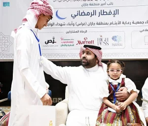 من جانبه، أعرب رئيس مجلس إدارة جمعية الأيتام بجازان ناصر بن عبده مريع، عن سعادة الجميع بمشاركة سموِّه أبناءَه الأيتامَ والأشخاص ذوي الإعاقة وأبناء الشهداء إفطارَهم الرمضاني، الذي يتزامن مع جميع الجمعيات الأخرى على مستوى المملكة في نفس التوقيت، لتكون تظاهرة سعودية ليس لها مثيل على مستوى العالم في رعاية الأيتام والاحتفاء بهم، سائلاً الله تعالى أن تكون هذه المبادرة في موازين حسنات سموِّه، وأن يكون عائدها على الأبناء الأيتام برًّا وخيرًا وصلاحًا.